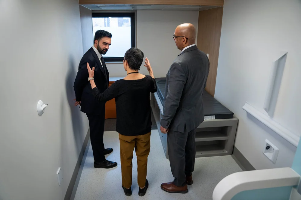 Mayor Zohran Mamdani, Dr. Patricia Yang, and Department of Correction Commissioner Stanley Richards tour a private cell in Bellevue Hospital’s new jail ward. Photo by Ed Reed/Mayoral Photography Office