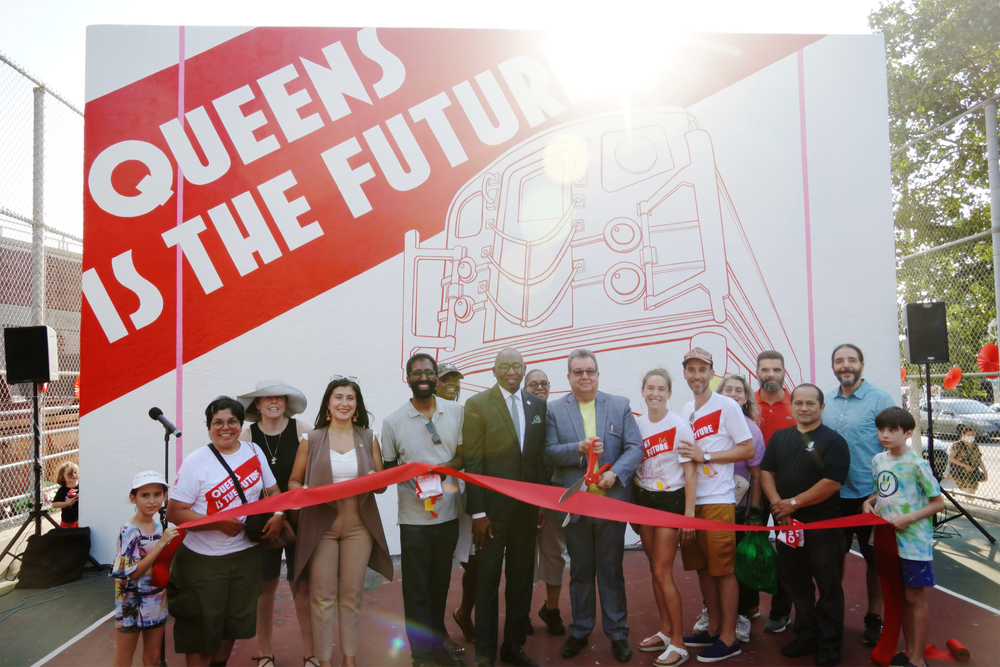 Queens pols and artists Eve Biddle and Joshua Frankel unveil a restored “Queens is the Future” mural in 2022. Photo by Bridget Bartolini
